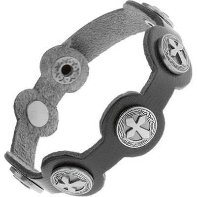 Nastavitelný kožený náramek černé barvy, pět spojených kruhů s patinovanými kříži maltézských rytířů.