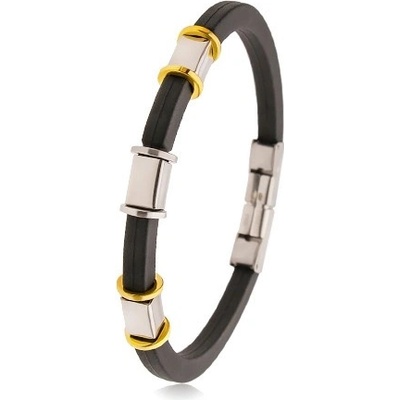 Náramek z černé gumy zdobený zářezy, ocelové hranoly a kruhy ve zlatém a stříbrném odstínu.