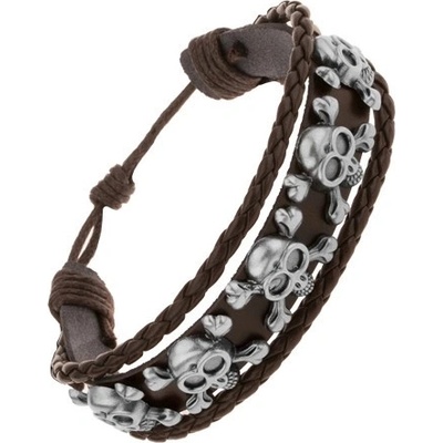Multináramek na zápěstí - tmavohnědý kožený pás, ocelové lebky s kostmi, zapletené pásky.
