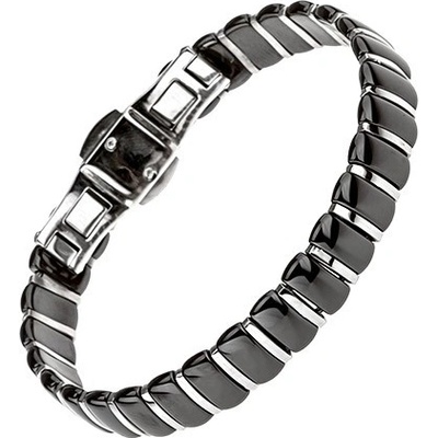 Ocelovo-keramický náramek, lesklé úzké články černé barvy, proužky z oceli ve stříbrném odstínu.