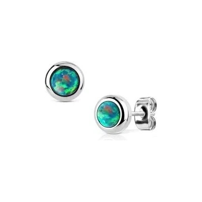 Drobné ocelové náušnice zdobené syntetickými opály modré barvy Náušnice jsou vyrobeny z chirurgické oceli s jakostním označením 316L a mají lesklou povrchovou...