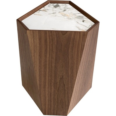Stylový odkládací stolek s asymetrickým geometrickým tvarem bude dekorativním i praktickým prvkem vašeho interiéru. Masivní konstrukce z ořechové dýhy nese zapuštěnou...