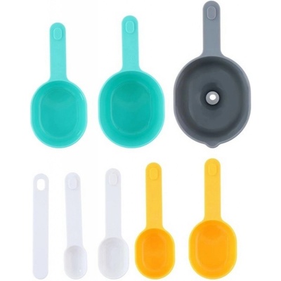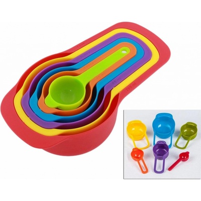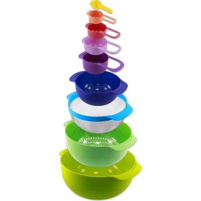 Objevte barevnou a praktickou sadu 10 dílů, která zahrnuje misky, odměrky a cedníky. Když všechny díly složíte dohromady, vytvoří se krásná duha barev!.