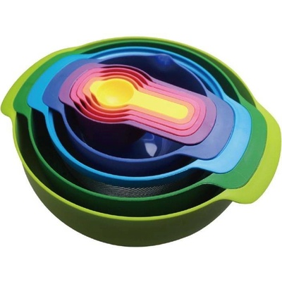 Položku máme SKLADEM. Vlastnosti: Sada na přípravu pokrmů o 9 kusech Inovativní design šetřící místo 5 odměrných lžic Nerezové sítko Plastová odměrka Velké míchací misky...