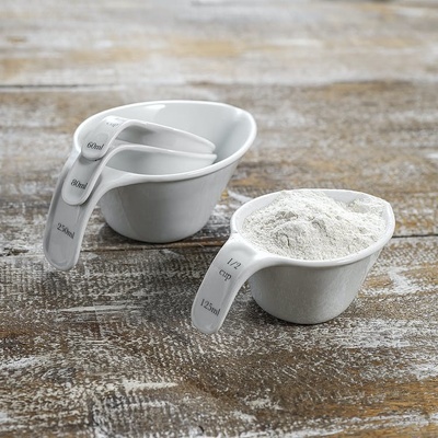 Sada 4 kusů porcelánových odměrek s nápisy v ml (60,80,125 a 250 ml) nebo cups (hrnky). Materiál: bílý porcelán Rozměry: 60 ml - výška 4 cm, šířka 11,5 x 6,2 cm 80 ml -...