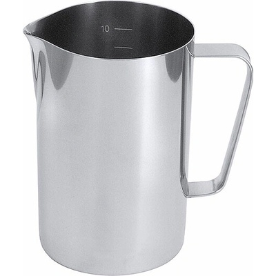 Odměrka z leštěné nerezové oceli s výlevkou a cejchem každých 0,1 l.