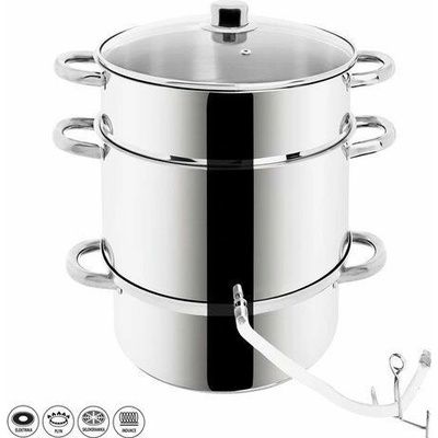 Hrnec na odšťavňování pro přípravu sirupů i džemů. Kvalitní nerezová ocel 18/10. Varná nádoba se sendvičovým dnem. Sběrný hrnec s vypouštěcí hadičkou. Perforovaný hrnec k propařování ovoce. Skleněná poklice s otvorem pro únik páry. Vhodný na všechny druhy spotřebičů...
