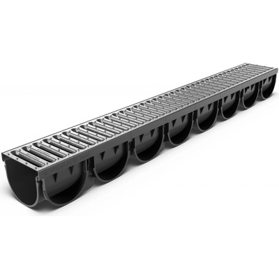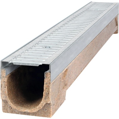 Odvodňovací žlab s pozinkovanou mříží , pochůzný A15 ( 1,5 t ) , délka 1 m . Výška 105 mm , šířka 130 mm . Možnost spodního vývodu na 3 místech