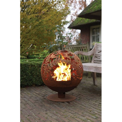 Ocelové venkovní ohniště na podstavci. S otvory v podstavci pro možné uchycení k podkladu. Designové zpracování koule v hnědo-červené barvě rzi s laserově vyřezanými vzory luční...