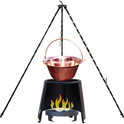 Kotlíková souprava obsahuje: Měděný kotlík 14 L. Klasický stojan, délka 1,2 m. Chránič plamene. Přenosné ohniště 36 cm. Kotlíková souprava na outdorové vaření guláše a rybích...