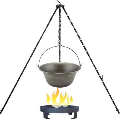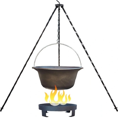 Kotlíková souprava obsahuje: Železný kotlík 10 L. Klasický stojan, délka 1,2 m. Chránič plamene. Přenosné ohniště 36 cm. Kotlíková souprava na outdorové vaření guláše a rybích...