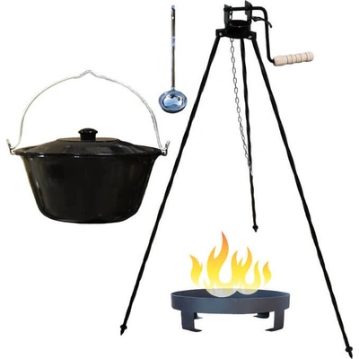 Kotlíková gulášová a grilovací souprava obsahuje: Smaltovaný kotlík 30 L. Smaltovaná poklice. Smaltovaná pánev na grilování. Prenosne ohniště se stojanem a s kladkou. Dřevěná...