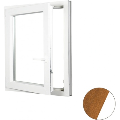 Jednokřídlé plastové okno 50x80 cm v bílé barvě z interiéru a v dekoru zlatý dub z exteriéru. Okno je ve verzi s pravým otevíráním tzn. panty jsou umístěny na pravé straně...