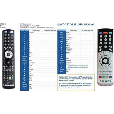 Dálkový ovladač OPENBOX SX4, SX4 BASE, SX6, SX9, AS2 HD duplikát 1:1 originálního dálkového ovladače. Dálkový ovladač je určen pro tyto modely :AS2 HD, SX4, SX4 BASE, SX4-BASE, SX5, SX6, SX9. (Nemusí zde být uvedeny úplně všechny kompatibilní modely. Pokud si nejste...