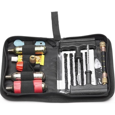 Kompletní opravná souprava na defekty pneumatik. Baleno v ochraném uzavíratelném pouzdře. Souprava obsahuje: 3 x bombička s CO2 1 x konektor kompletní...