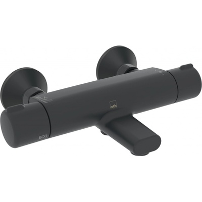 - vanová baterie s výtokem- excentrické přípojky- armatura: nástěnná- termostatická hlavice s omezovačem nastaveným na 38 °C- materiál: mosaz s nízkou korozivností- baterie...