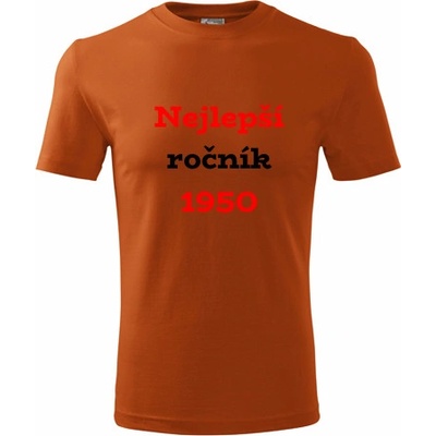 Oranžové tričko Nejlepší ročník 1950. nabízené velikosti jsou S,M,L,XL,XXL,XXXL. Tričko je zařazeno v sekcích Trička s rokem narození 1950, Trička s rokem narození, ....