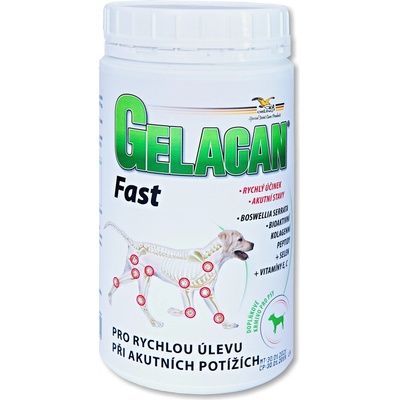 Popis produktu Akutní bolest Gelacan Fast je práškové doplňkové krmivo, které obsahuje komplex účinných složek pozitivně ovlivňujících zánětlivé procesy v kloubních, šlachových a vazivových tkáních, zvyšujících kloubní pohyblivost a omezujících bolestivost kloubů v...