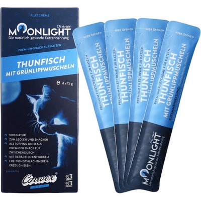 MOONLIGHT Dinner Tuna with mussel - pamlsek pro kočky - 4x15g Další funkce: Bez kuřecího masaCelkový zdravotní stavBez lepku Bez umělých barviv: Ano Stáří zvířete: Dospělí...