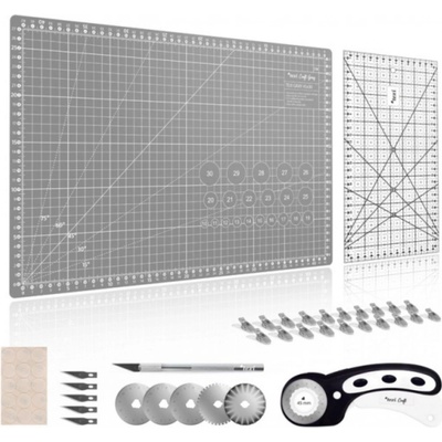 Sada řezací podložky, řezacího kolečka s náhradními čepelemi, skalpelu s náhradními čepelemi, pravítka, kolíků a protiskluzových samolepek. Pětivrstvá řezací podložka se...