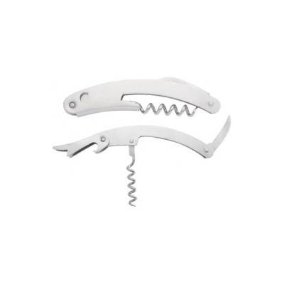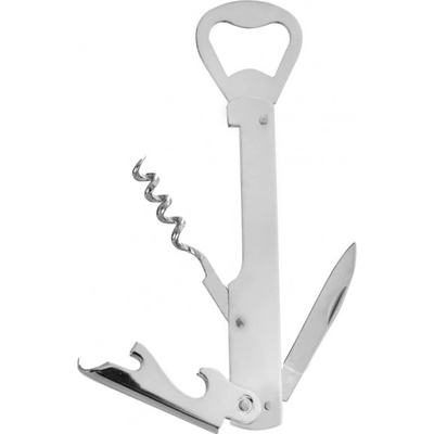 Kovový otvírák na lahve, malý nožík a vývrtka.