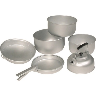 Pětidílná souprava na vaření z leštěného hliníku. Obsahuje pánev se sklopným uchem, pánev s uchem pro zavěšení a pokličkou, misku a plastový šálek. Vše snadno zabalíte do...