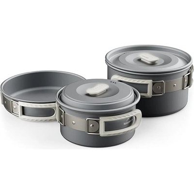 Kempingové nádobí Materiál: Hliník Hmotnost: 752 g Hrnec 1: Objem: 3,8 Litr rozměry: 21,7 x 4,12 cm Hrnec 2: Objem: 2,85 Litr rozměry: 18,8 x 9,3 cm Hrnec 3: Objem: 1,9...