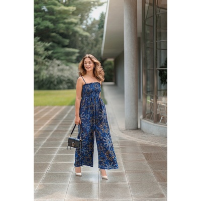 Kalhotový overal Runa - tmavě modrá se zlatou Tento parádní kalhotový overal na ramínka je nejen originální, ale také velmi pohodlný. Široké žabičkování ve vrchní části vytvoří...