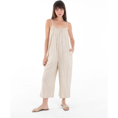 Lehký dámský overal vyrobený z přírodní, prodyšné mušelínové bavlny, ideální na teplé dny. Jemné volánky na ramenou dodávají celku subtílní, ženský charakter, a elastický pas...