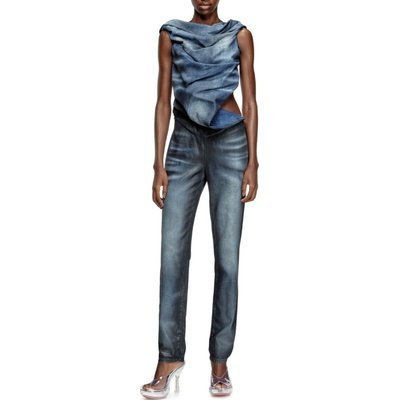 Dámský džínový overal. Model je pzoruhodným kouskem z kolekce Diesel Fashion Show jaro-léto 2025. Materiál kombinuje dvě tkaniny s mramorovým praním v tonálních odstínech, ušité...