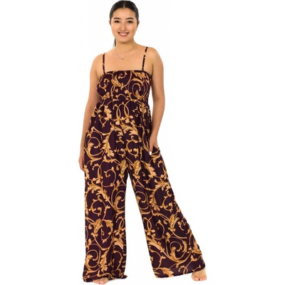 Kalhotový overal Persia - vínová se zlatou Tento parádní kalhotový overal na ramínka je nejen originální, ale také velmi pohodlný. Široké žabičkování ve vrchní části vytvoří...