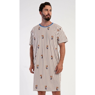 Pánská bavlněná noční košile s krátkým rukávem Bear. Proužkovaná pánská noční košile s kulatým výstřihem a délkou po kolena je potištěna medvídky. Použitý materiál s obsahem...
