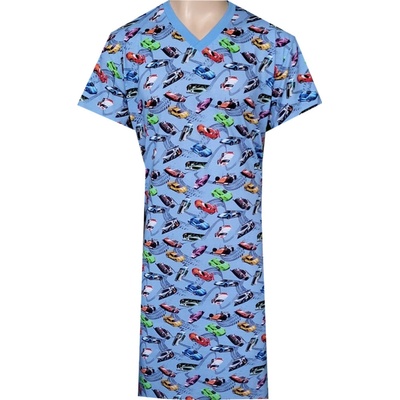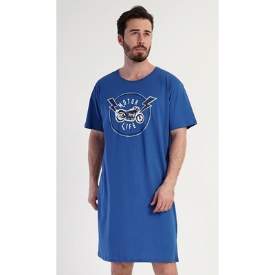 Pánská bavlněná noční košile s krátkým rukávem Motocycle. Jednobarevná pánská noční košile s kulatým výstřihem a délkou po kolena má na hrudi obrázek motocyklu a nápis 'Motor...