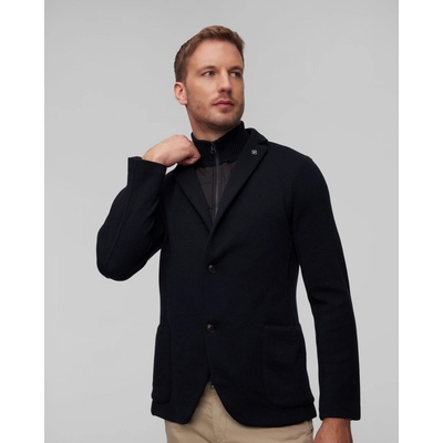 Pánské úpletové sako se zapínáním na tři knoflíky. Má kapsy na přední straně v dolní části a jednu otevřenou kapsičku na hrudi s možností vytáhnutí kapesníčku. Sako v tmavě...
