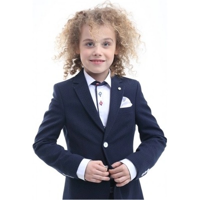 Chlapecké elegantní tmavě modré sako, se vzorem drobného puntíku, vhodné na jakoukoliv příležitost.- klasický střih- zapínání na bílo modré knoflíky- kapsy s volbou patky-...