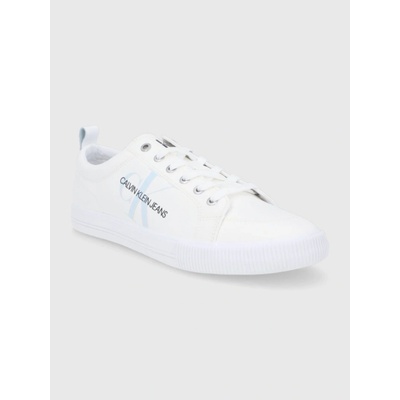 Pánské bílé látkové tenisky od Calvin Klein.Podrážka boty je plochá a špička kulatá.Boty mají logo na vnější straně.Materiál:100% bavlna
