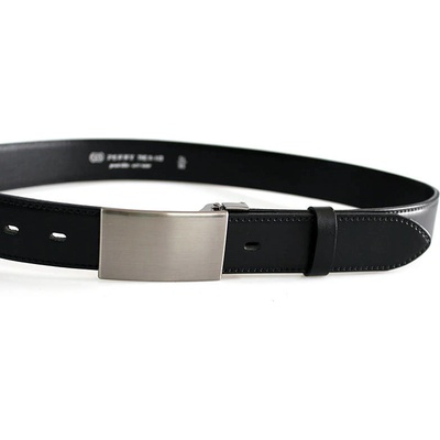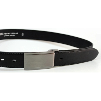 Luxusní černý pánský kožený opasek o šířce 35 mm má zajímavě řešenou plnou sponu s povrchovou úpravou NKS (nikl satinato). Tento opasek nemá dírky - spona AUTOMAT se zapíná...