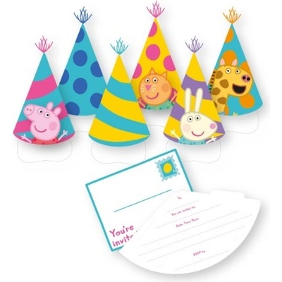 Papírové party čepičky spolu pozvánkami v jednom v motivu nové kolekce Prasátko Peppa Party. Čepičky mají motiv hlavní hrdinky Pepiny i všechny její kamarády s veselým úsměvem...