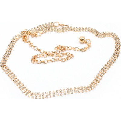 Kovový pásek na šaty ve zlaté barvě se třemi řadami štrasových kamínků. Délka pásku 65 cm, šířka pásku 1 cm, délka řetízku 49 cm,