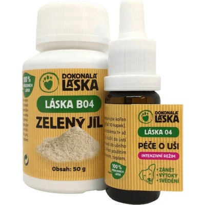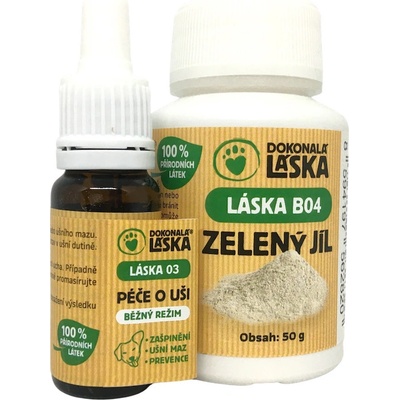 Zvýhodněný balíček PÉČE O UŠI - Láska 03 10ml + zelený jíl 50g Balíček obsahuje: LÁSKA 03 Péče o uši v běžném režimu 10 ml a LÁSKA B04 Zelený jíl 50 g. LÁSKA 03 Péče o uši...