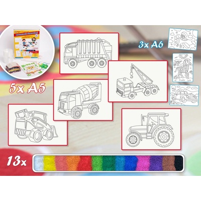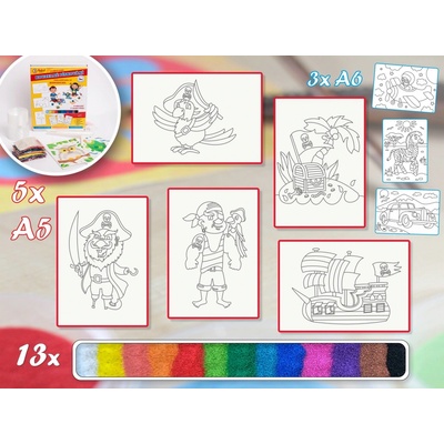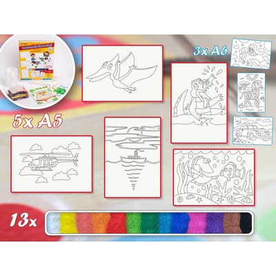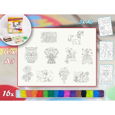 Balení obsahuje: - 5x šablonu velikosti A5 (148 x 210 mm) - 3x šablonu velikosti A6 (105 × 148 mm) - 13x barevný písek v miskách po cca 16-20g. - 1x velký špendlík - 1x...