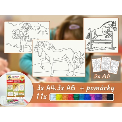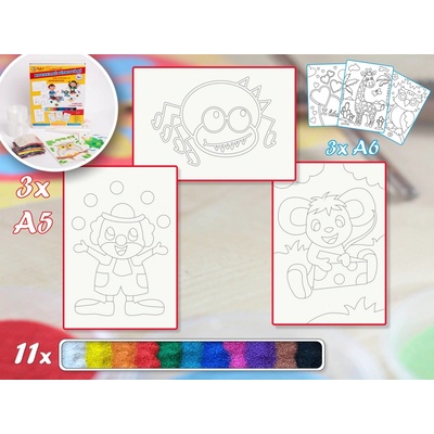 Šablony, dostatek barevného písku (cca pro 20-25 šablon), obaly na šablony, pomůcky a návod pro pískování. Složení obrázků můžete vidět na úvodní fotografii. Šablony jsou vhodně...