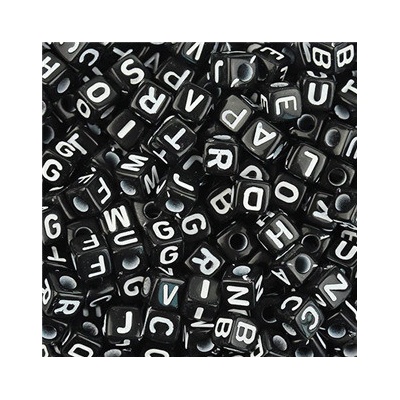 Černý plastový navlékací korálek ve tvaru kostky pro výrobu dětských náramků a jiných šperků Korálek je vyroben z plastu a je zdoben bílým písmenem