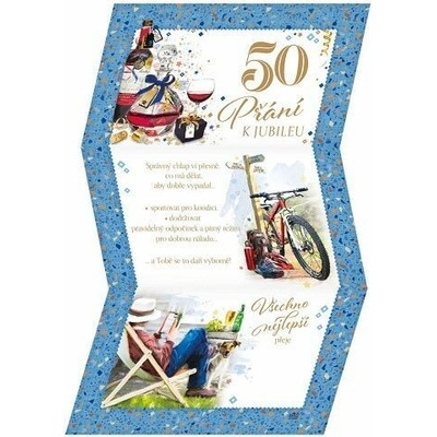 Blahopřání k padesátinám a přivítání do klubu padesátníků. Rozměr: něco kolem A5 Křídový papír 300g/m2 + obálka