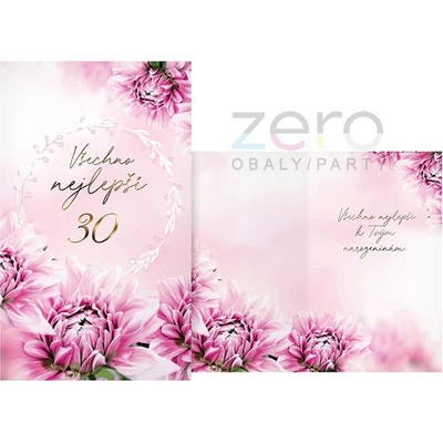 Přání s textem k 30-tým narozeninám s obálkou:Rozměr: 114 x 190 mm (ve složeném stavu)Text na přední straně:Všechno nejlepší30Text uvnitř přání:Všechno nejlepšík Tvým narozeninám.