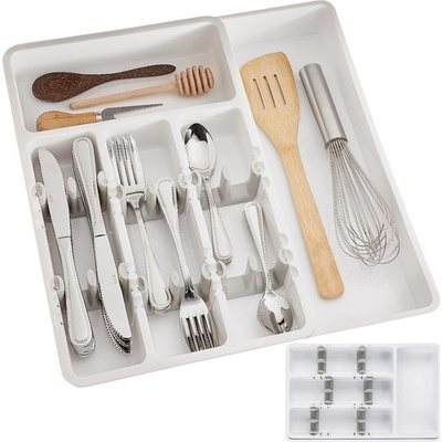 Udržujte pořádek v kuchyňské zásuvce s výsuvným organizérem do příborů. Nastavitelné přihrádky, snadné čištění a odolný plast. Ideální řešení pro každou kuchyň. Barva: bílá.