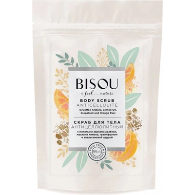 Tělový peeling proti celulitidě 200g Bisou Anticelulitidový peeling na bázi cukru a mořské soli s mletými kávovými zrny. Složení: Chlorid sodný (mořská sůl), sacharóza (cukr)...