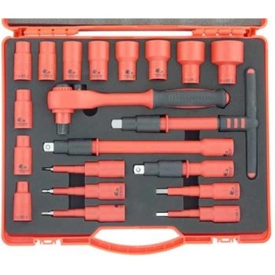 Charakteristika : - gola sada nástrčných a zástrčných klíčů pro práci pod napětím do 1000 V - hlavice 1/2": 10, 11, 12, 13, 14, 17, 19, 22, 24, 27, 32 mm - 1/2" ráčna + 2x...