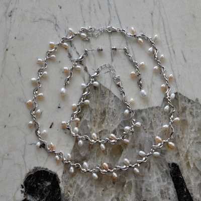 Stříbrná souprava s říčními perlami - náhrdelník, náramek a náušnice. Perličky jsou ve tvaru oválků v pastelových tónech bílé a béžové. Náhrdelník Délka: 40-45 cm (zkracovací...