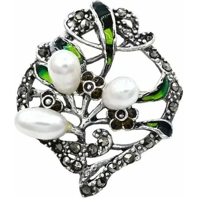 Krásná stříbrná brož s perlami (syntetické), markazitem a zirkony. Krásně propracované detaily. Brož má na rubové straně očko, lze ji zavěsit i na řetízek jako přívěsek Rozměry:...